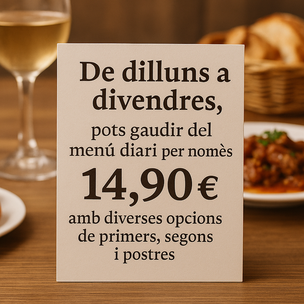 De dilluns a divendres, pots gaudir del menú diari per només 14,90 €, amb diverses opcions de primers, segons i postres.