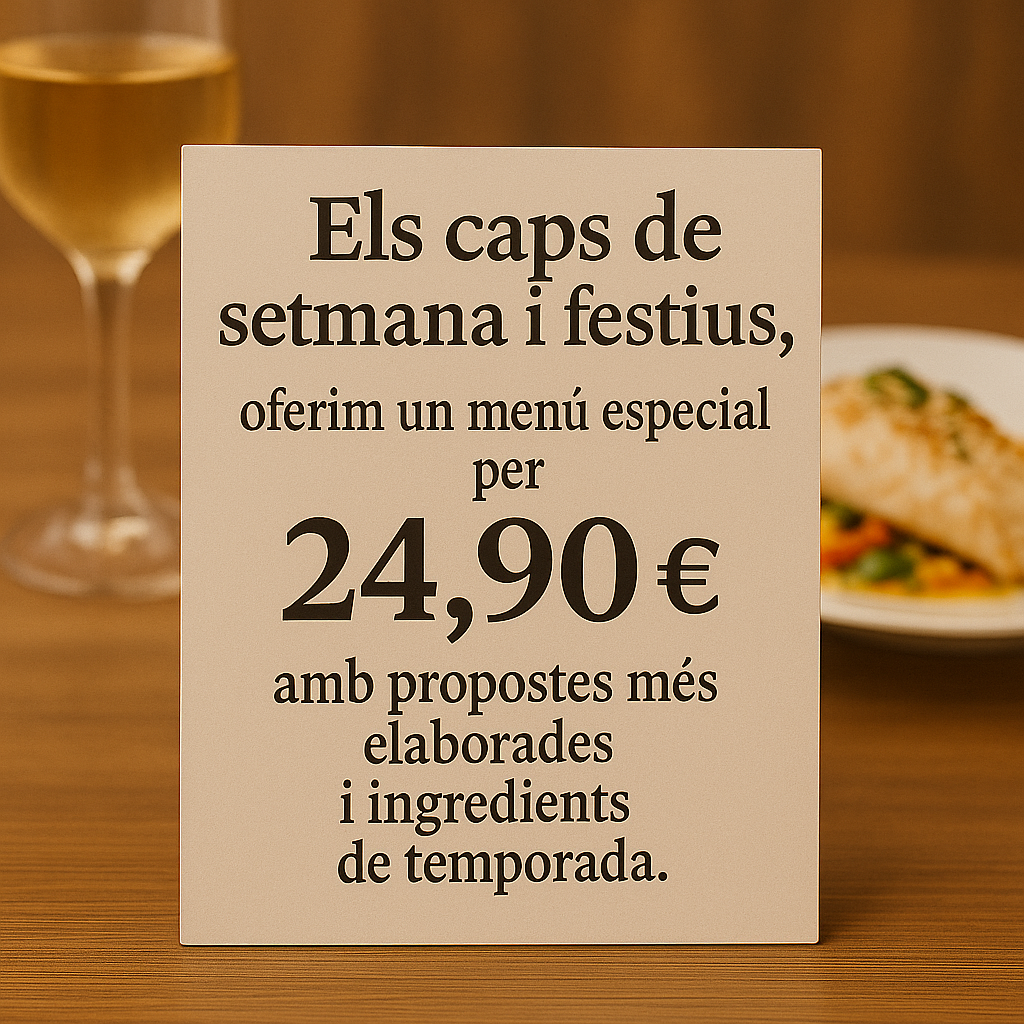 Els caps de setmana i festius, oferim un menú especial per 24,90 €, amb propostes més elaborades i ingredients de temporada.